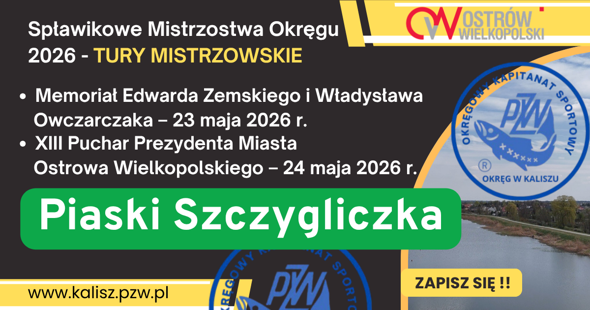 Okręgowy Kapitanat Sportowy PZW w Kaliszu zaprasza na finałowe tury Spławikowych Mistrzostw Okręgu 2026, które jednocześnie rozegrane zostaną w ramach: